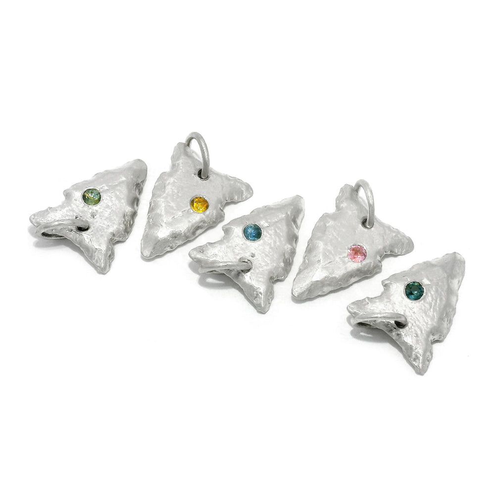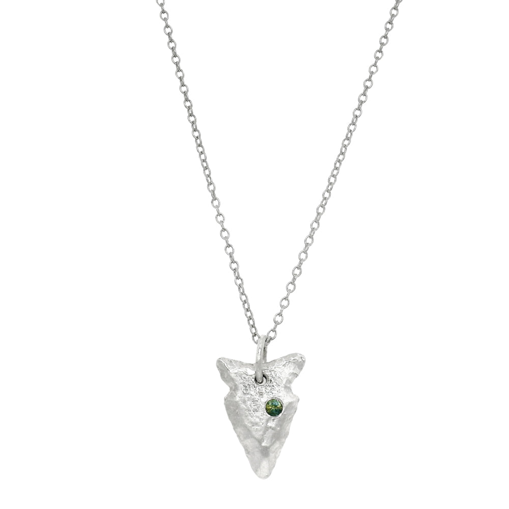 Small yet striking, this sterling silver arrowhead pendant is finished with a soft satin texture that highlights its clean, sculptural form. A flush-set yellow-green Montana sapphire adds a vivid pop of color, its rich hue bringing unexpected brightness to the understated design. Thoughtfully crafted and easy to wear, this pendant strikes a balance between subtle symbolism and modern simplicity. Perfect for everyday layering or as its own. A little piece of Montana to carry with you.