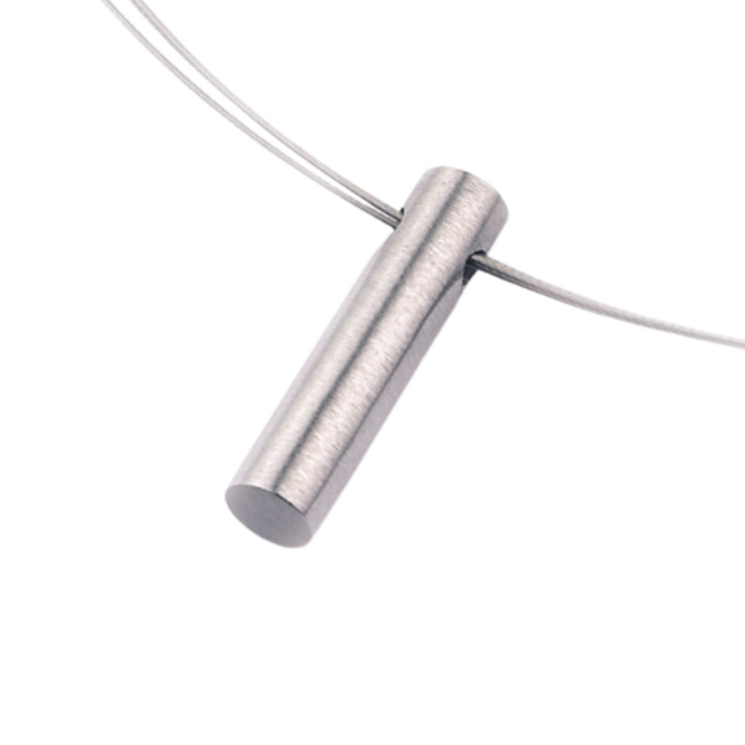 Modern, sleek, nickel-free stainless steel pendant with a simple, cylindrical shape. The perfect metal piece to add to your everyday wardrobe!