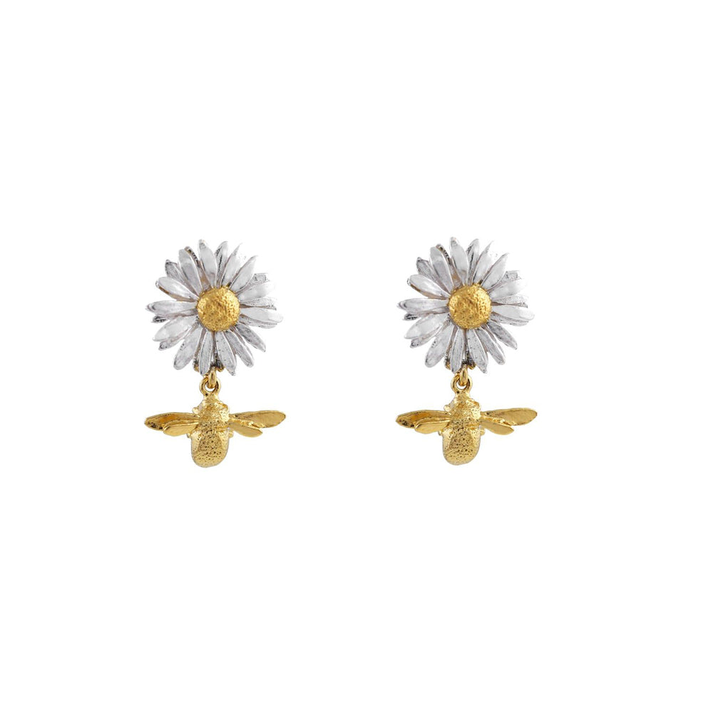 In a collection designed to complement Alex Monroe's classic bee styles, pretty florals are greeted by their fuzzy, buzzy friends! Sweetly sophisticated, these daisy flower stud earrings are adorned by teeny tiny bee drops.