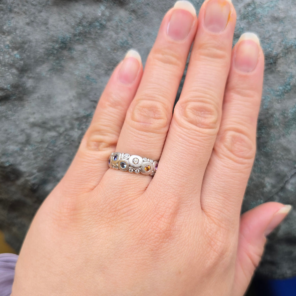 An Alara exclusive, this "Candy" ring by Alex Sepkus is set with Montana sapphires, Yogo sapphire, and white diamonds, stacked in asymmetrical pillows of bright platinum. This ring also features Alex's signature texturing, adding soft depth to this special piece.