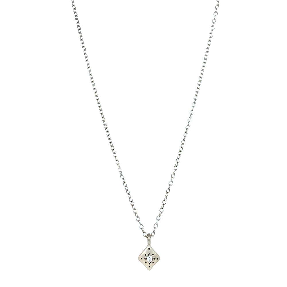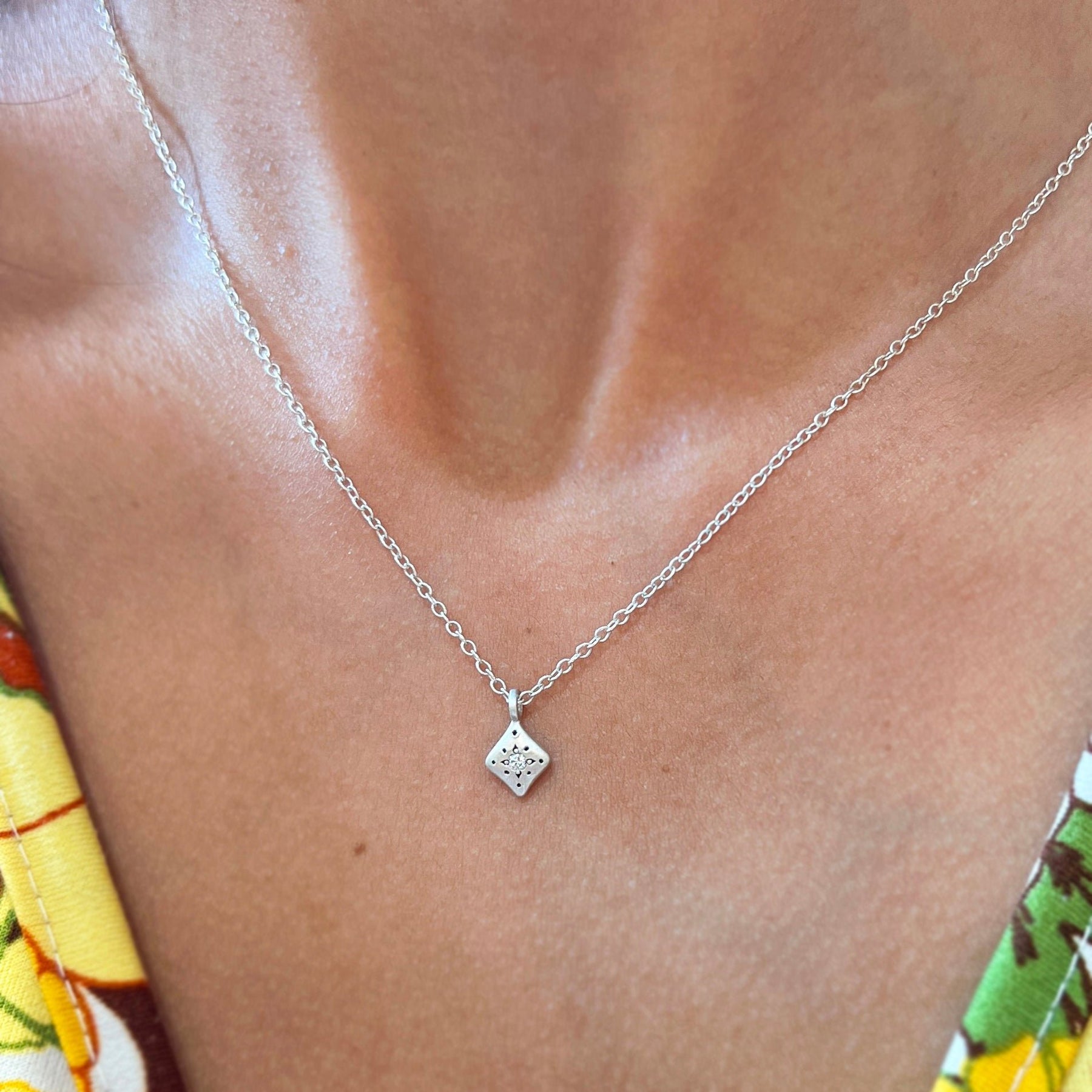 A tiny shape in the semblance of a star, a glittering diamond set at its center, hangs from a delicate silver chain. Petite, perfect for stacking or wearing alone, this necklace is a must-have for your collection!
