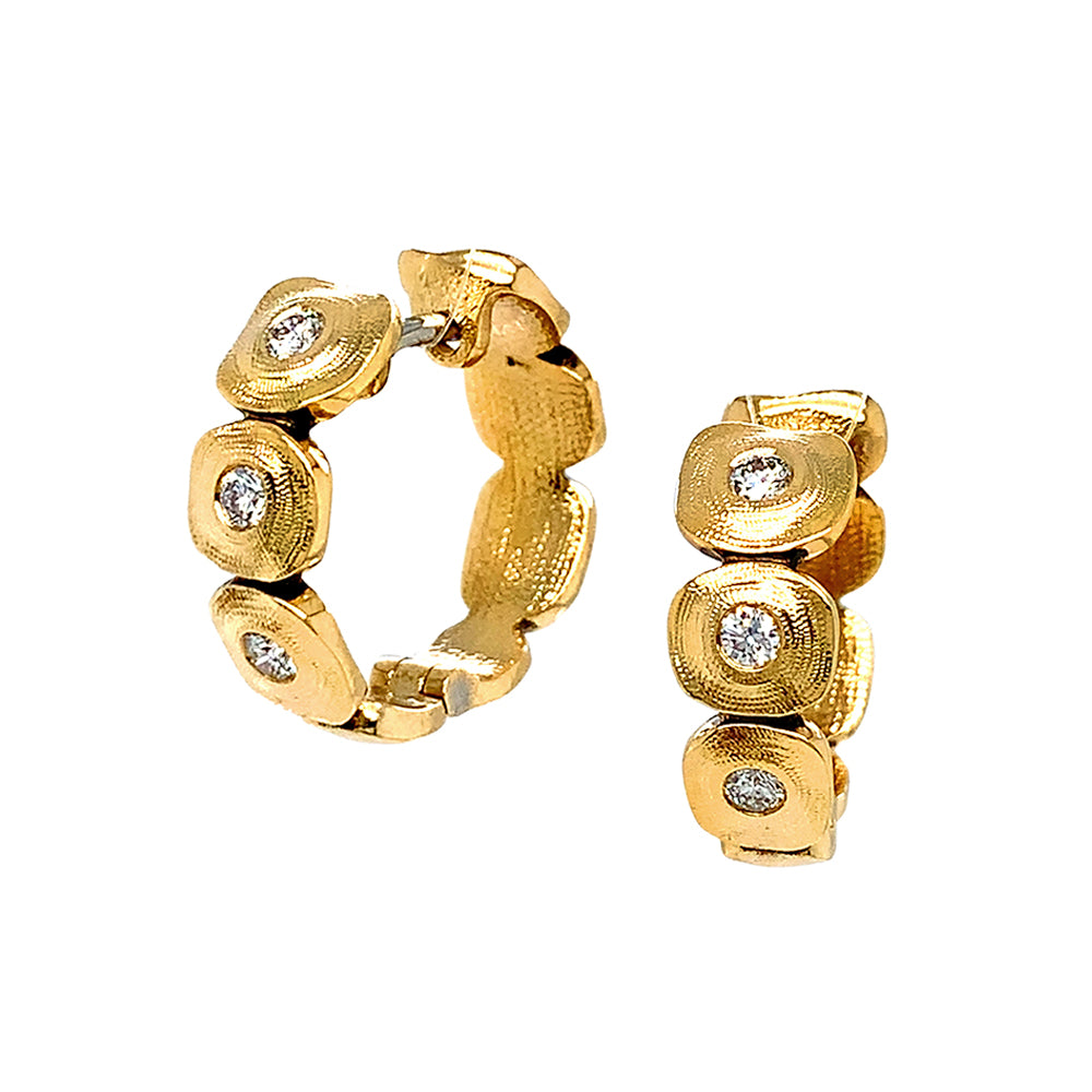 These yellow gold hoop earrings by Alex Sepkus showcase a multi-cushion-shaped design, each adorned with a sparkling diamond. The unique texturing on the gold gives the earrings a rich, tactile look and feel, enhancing their unique appearance. Classic with a modern twist, these hoops are a testament to Sepkus' meticulous craftsmanship.