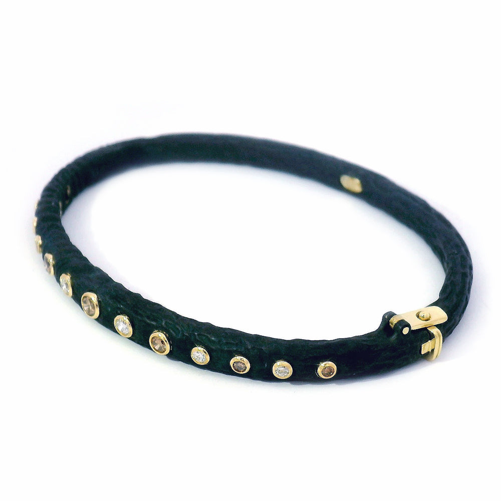 This bold, hinged bracelet by Sarah Graham combines a gorgeous mix of white diamonds and cognac diamonds. The diamonds are truly reminiscent of a glass of cognac lit by firelight, and are bezel-set in a rich yellow gold. The contrast against a deep, oxidized cobalt chrome is striking! The bark-like detail is inspired by nature, and the bracelet has an eye-catching clasp & hinge, adding to the security of the cuff around your wrist.