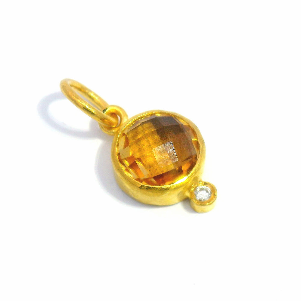 A radiant, round faceted citrine glowing with warm golden hues, set in rich yellow gold. Set below, a small diamond accent adds a subtle touch of sparkle. Thoughtfully crafted by Prehistoric Works, this pendant brings a sunny warmth and natural elegance to a timeless piece.
