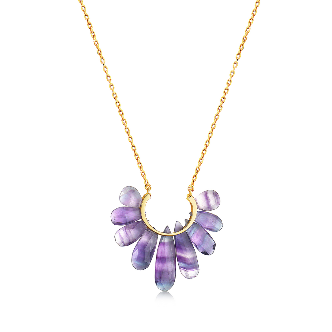 Inspired by the vibrant hues and iridescence of a peacock's plumage, each earring features a fan-like arrangement of hand-cut fluorite gemstones. The stones display a rich spectrum of purples and shimmering greens, reminiscent of the bird's feathers. Set in lustrous yellow gold, the delicate wirework complements the organic beauty of the fluorite, creating a graceful and luminous effect. A statement piece that celebrates the artistry of nature and contemporary design.