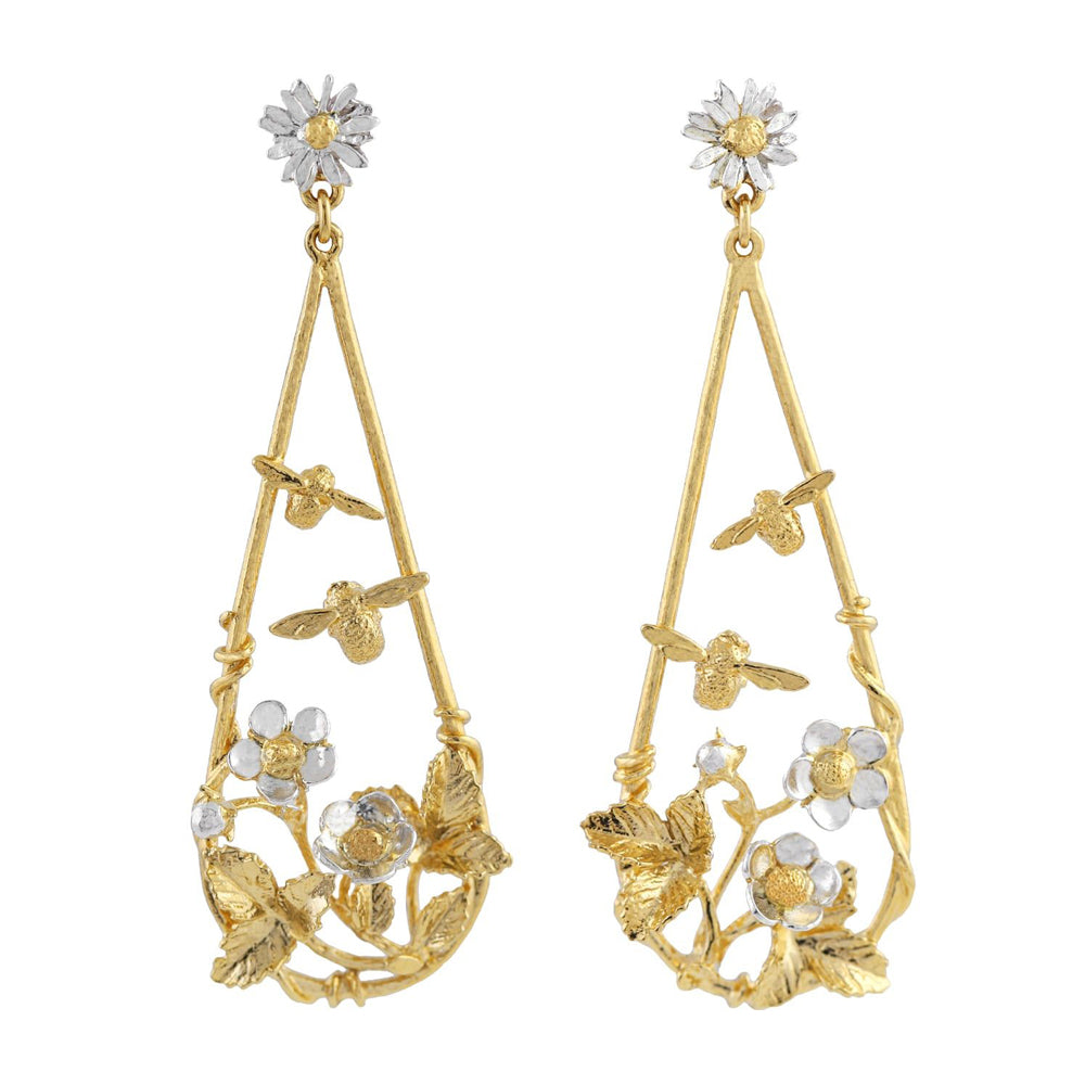 In a collection designed to compliment Alex Monroe's classic bee styles, pretty florals are greeted by their fuzzy, buzzy friends! Creating a subtle statement, these delicate strawberry patch teardrop earrings are proving a big attraction for the teeny bees. Handcrafted in sterling silver with gold vermeil detail in London!