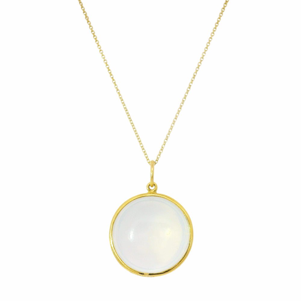 Featuring a luminous moon quartz cabochon, this necklace by Goshwara softly glows, with its surface offering a sense of calm elegance. Bezel set in warm 18K yellow gold, the larger pendant is cleanly framed to highlight the stone’s gentle translucence and natural depth. Suspended from a delicate gold cable link chain, the design feels light and refined, allowing the moon quartz to float effortlessly at the center.