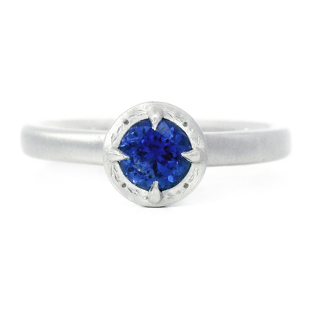 A Yogo sapphire ring by Adel Chefridi, with its deep, vivid blue reminiscent of Montana’s winter skies and glacier-fed waters. Set in luminous platinum, the stone is framed by delicate hand engraving along the rim, adding texture and artistry. Quietly striking and full of presence, this simple yet soulful design stands beautifully on its own and also serves as a meaningful, one-of-a-kind engagement ring.