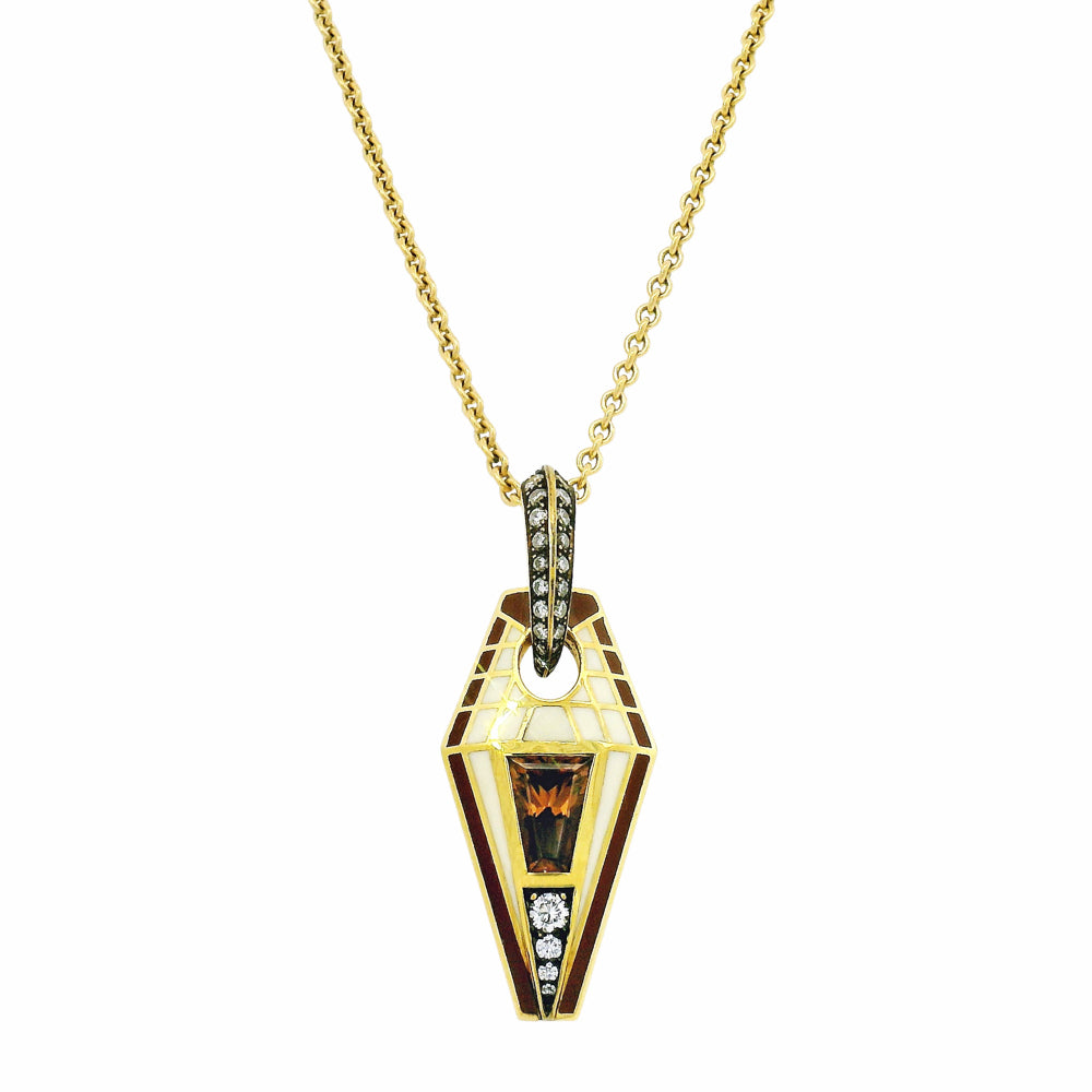 Featuring intricate enamel details & a stunning natural cognac zircon, this sarcophagus-like pendant by Lord Jewelry is truly a work of art. Brilliant diamond accents add a fabulous touch of sparkle that catches the light with every turn. Wear this pendant on your favorite gold chain, or inquire about chain options available here at Alara!Â