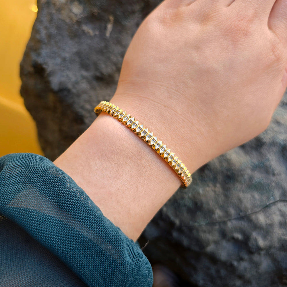 A one-of-a-kind hinged bracelet by Lord Jewelry, crafted in rich yellow gold and set with sixty-two Montana Yogo sapphires. The sapphires’ natural blue hues trace a continuous line around the wrist, their brilliance heightened by crisp white enamel accents. Architectural yet elegant, the hinged silhouette offers a smooth, comfortable fit while evoking the clarity and strength of mountain ridgelines. A striking balance of precision, craftsmanship, and luxury, Highline is a timeless statement piece that's modern and lightweight.