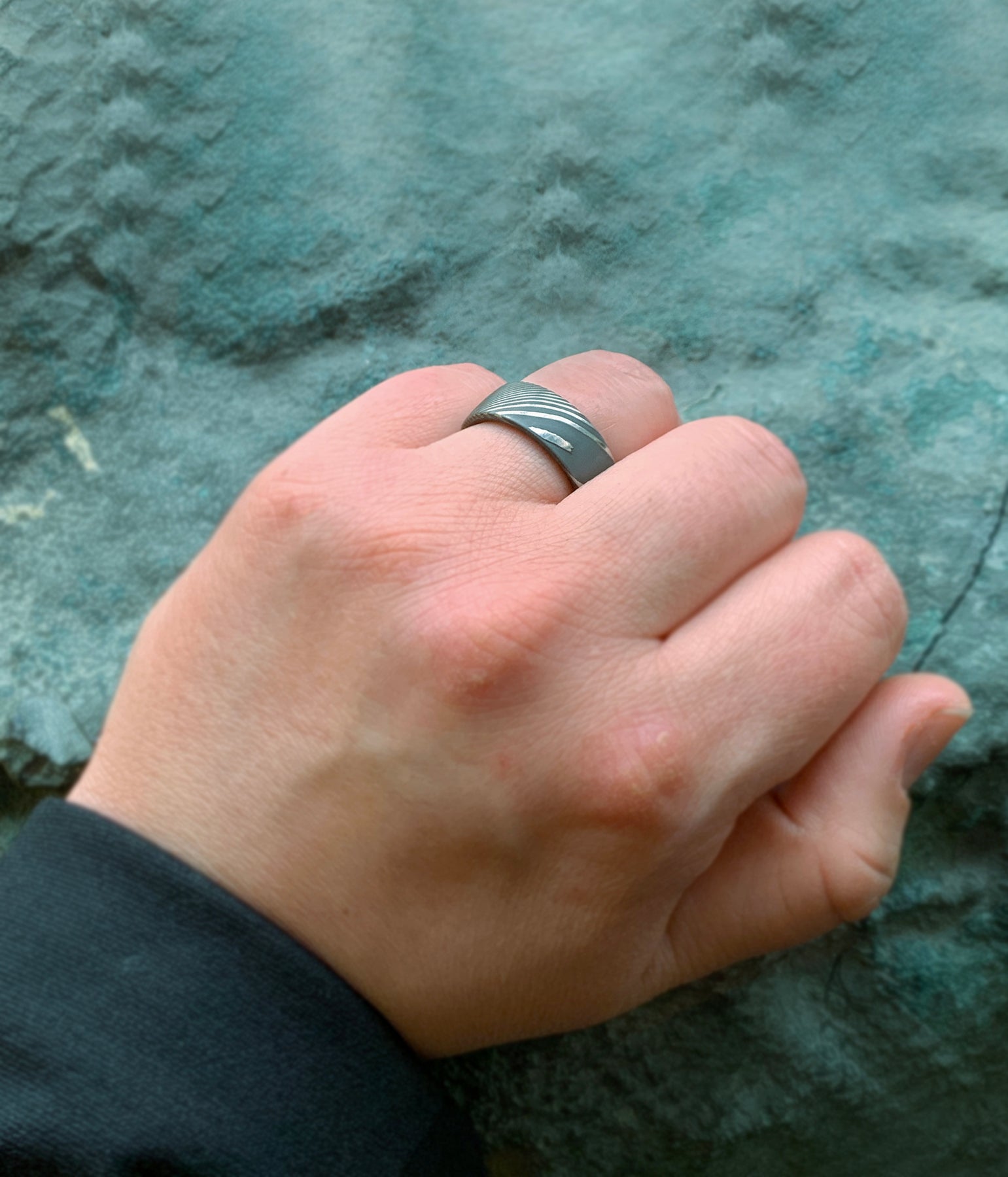 Like the ripples in a puddle, twisted Damascus steel patterns wrap around this beautiful men's band. A Cocobolo wood sleeve adds a warm contrast to the cool tones of the steel, and the comfort-fit interior allows the ring to slide on and off like butter.