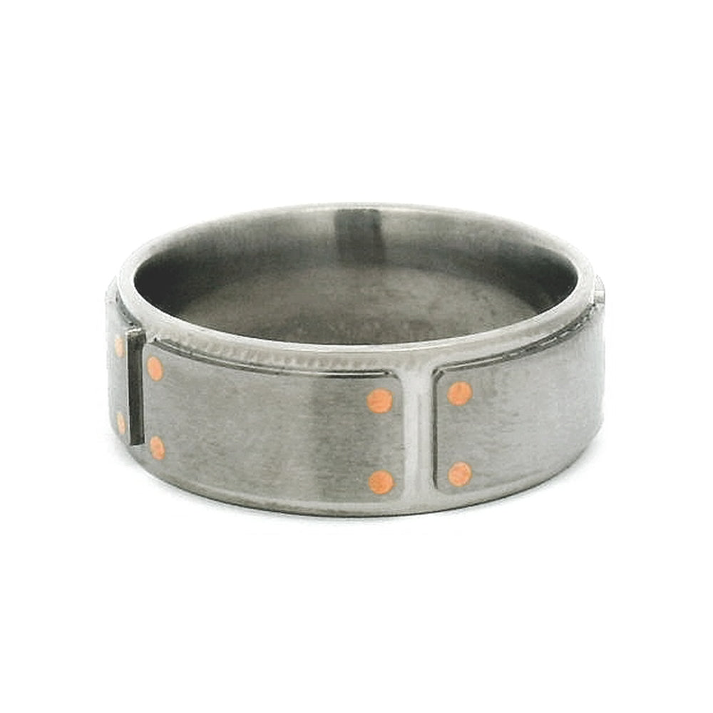 Titanium band featuring five raised rectangular plates, accented with 14k rose gold rivets, giving this men's band a unique and refined look.