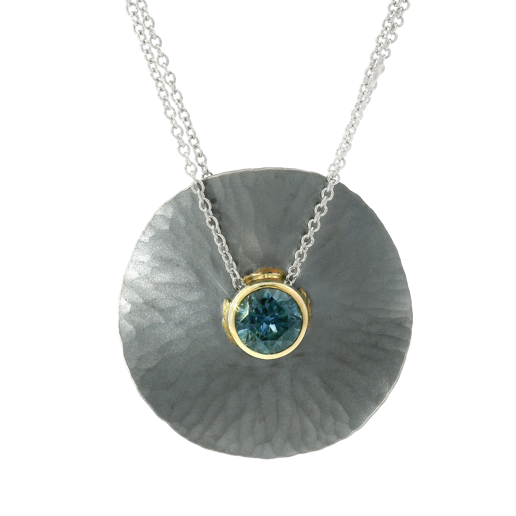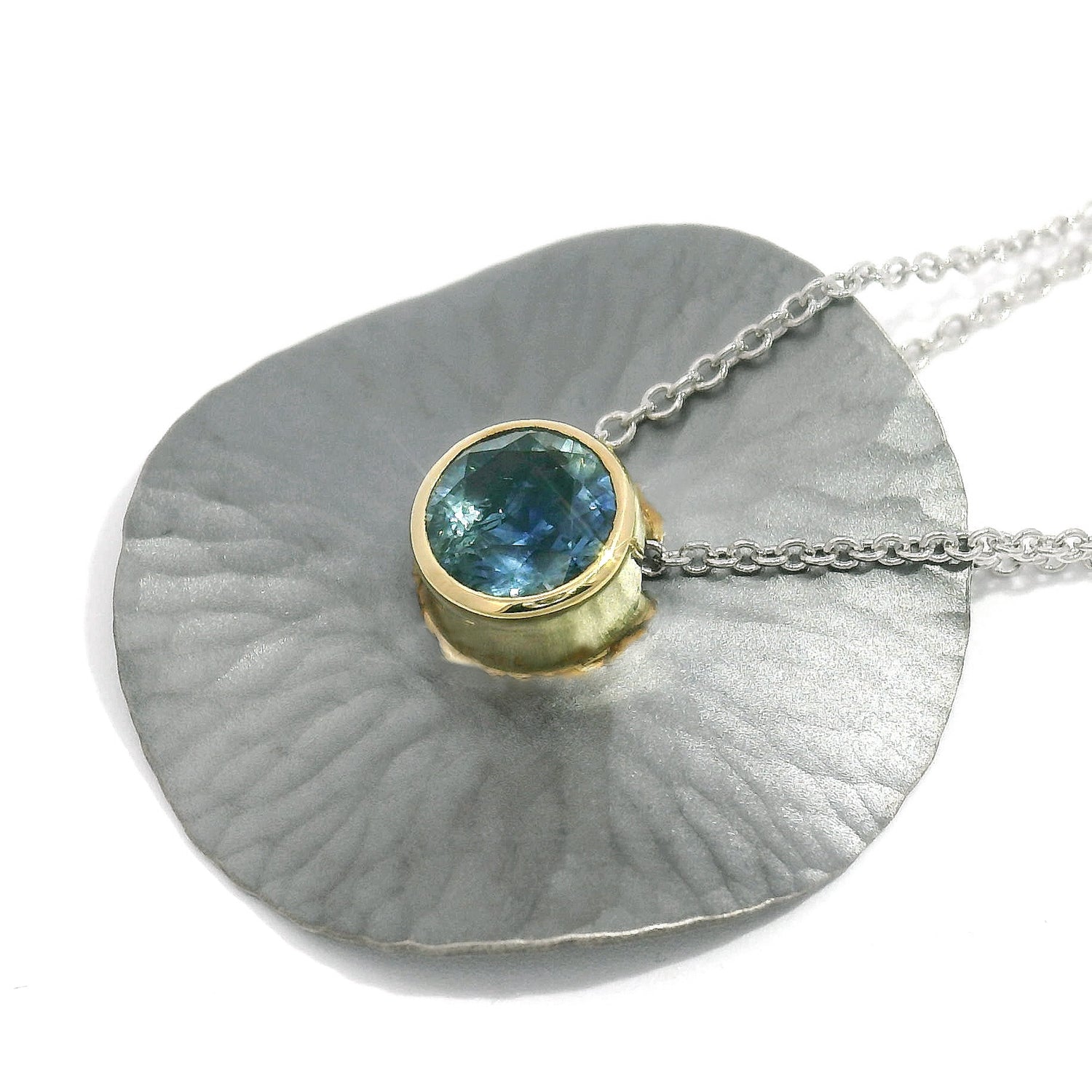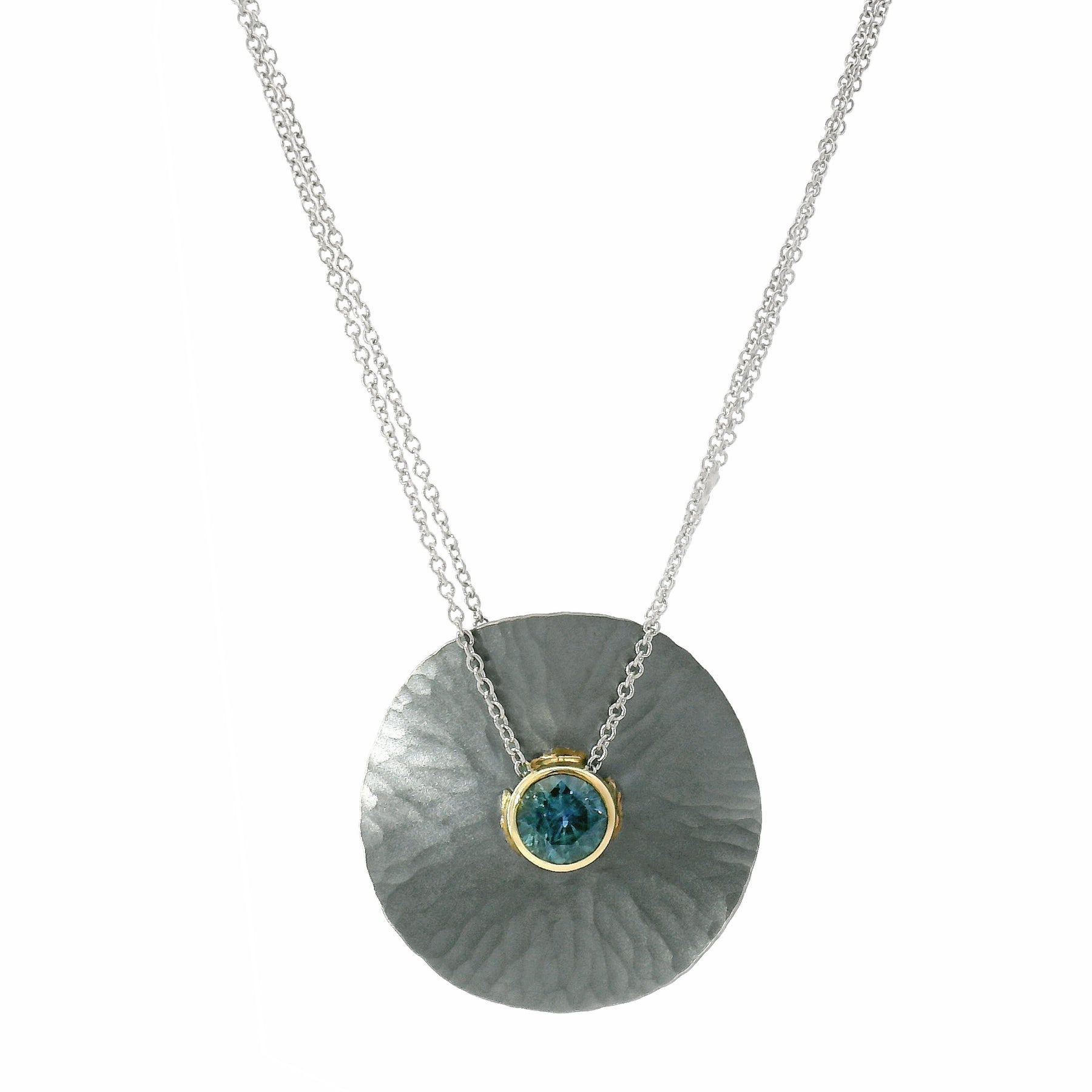 Like a shimmering pool in the desert haze, the playful texture of this sterling silver Oasis necklace catches light from every direction. A brilliant Montana sapphire sits nestled in the center, securely held by a yellow gold bezel. A dainty, doubled chain completes the look, making this piece the perfect finishing touch to any outfit.Â