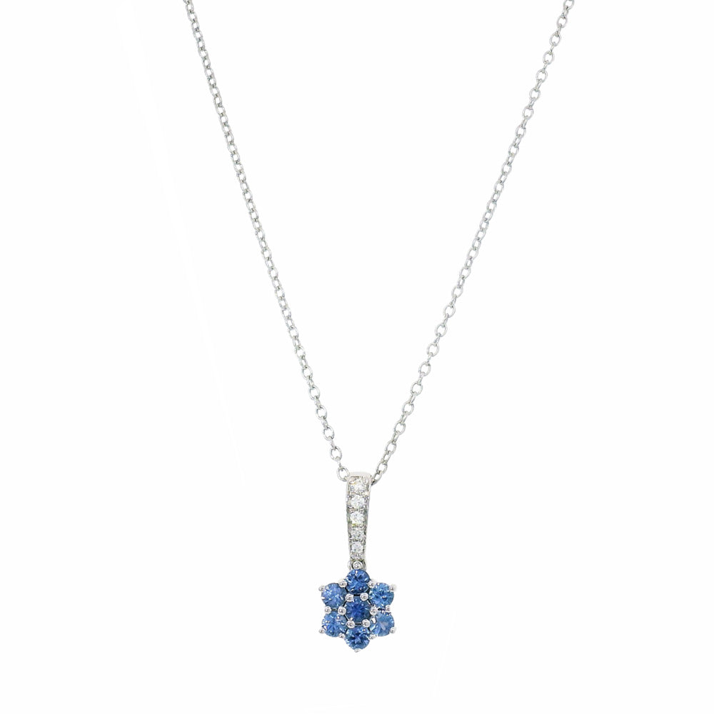 Delicate and nature-inspired, this Yogo sapphire pendant is crafted in bright white gold and features six luminous sapphires arranged in a graceful bellflower motif. Five petite diamonds cascade down the front of the bail, enhancing the rich blue-purple tones of the sapphires. Suspended from a dainty, adjustable cable chain (sold separately), this pendant offers an elegant balance of botanical beauty and refined brilliance.