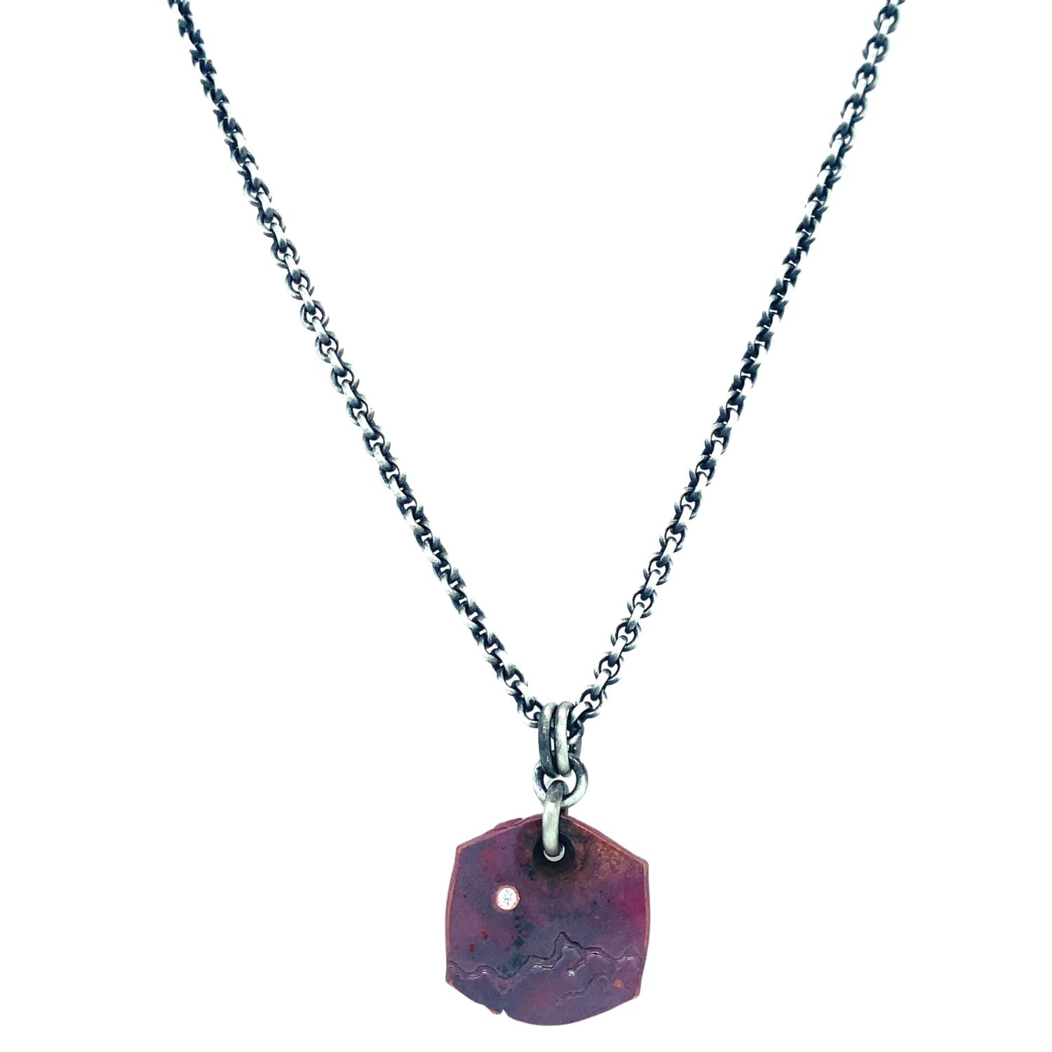 A bright white diamond sits like a bright full moon overlooking these etched mountains. This rustic pendant is complimented by an antiqued sterling silver chain. This necklace is unique and casual, it might just become your new everyday accessory!
