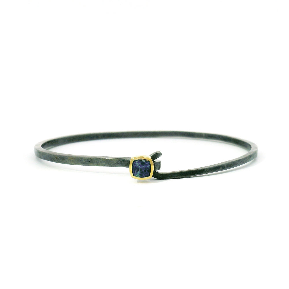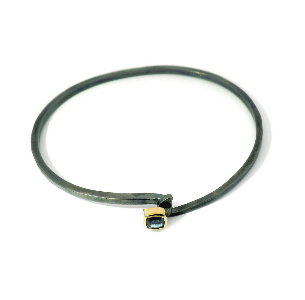 This artisan-crafted bangle bracelet blends the raw look of oxidized sterling silver with a gracefully sculpted hook closure, echoing the quiet strength of natural forms. At its center glows a cushion-cut Montana sapphire—deep blue and mysterious—cradled in a warm bezel of yellow gold. This mixed-metal design is a fashionably delicate, yet sturdy piece for everyday wear.Â