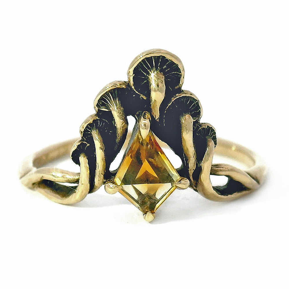 Sculpted mushroom caps rise delicately from the high polished gold band, their textured and blackened surfaces adding rich contrast and dimension. Together, they form a naturalistic crown that frames a geometric, yellow-orange kite-shaped Montana sapphire.Â