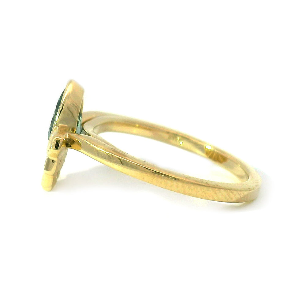 Like the flash of a bird's tail in a serene meadow, a fan studded with brilliant diamond accents furls out from the pavilion of a beautiful sea-blue pear-shaped Montana sapphire. The Montana sapphire is framed within a gold bezel, fine milgrain detail, completed with a high polish finish. Custom-crafted at Alara Jewelry's atelier in downtown Bozeman, Montana.