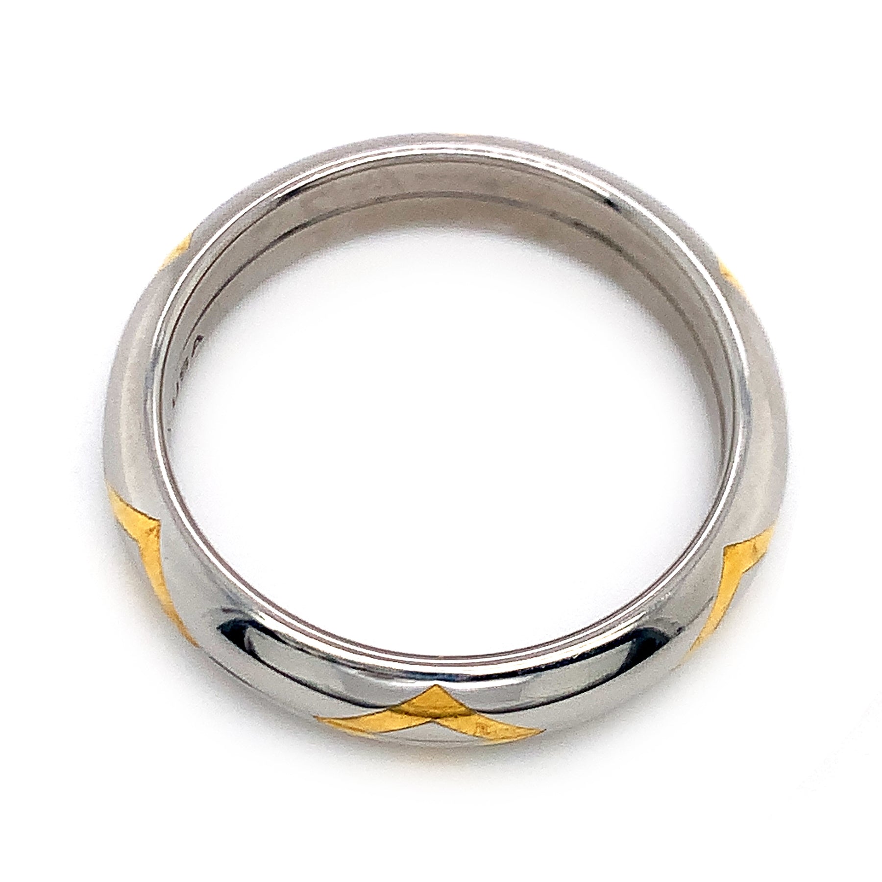 This band has a high polish finish and a golden inlay design. Mixing both silver and gold tones offers a timeless yet unique choice when picking the perfect piece of jewelry. The material it's made of is also very durable. Polarium is a revolutionary permanently magnetized platinum alloy developed by Steven Kretchmer for a line of jewelry that exhibits amazing behaviors, including levitation. It is 77.7% pure platinum, extremely hard, and resists scratching far better than any other precious metal jewelry alloy available anywhere.