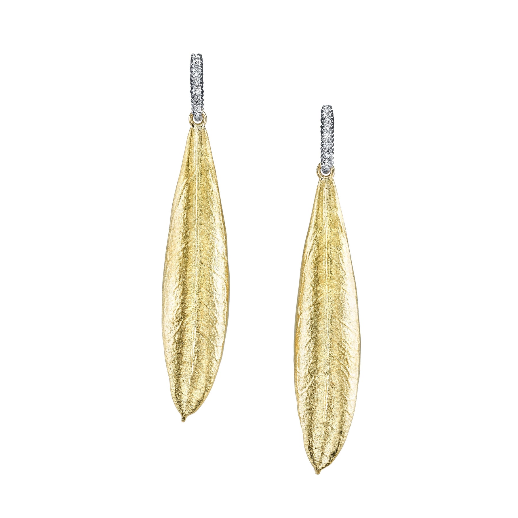 Inspired by nature, these exquisite gold olive leaf earrings have gentle movement and are a perfect weight. With subtle texturing and a glint of diamonds, the "aliveness" of these pieces can only be crafted by innovative techniques. The luxurious look and feel of these fine pieces of jewelry will be enjoyed for years to come and their understated elegance will never go out of style.