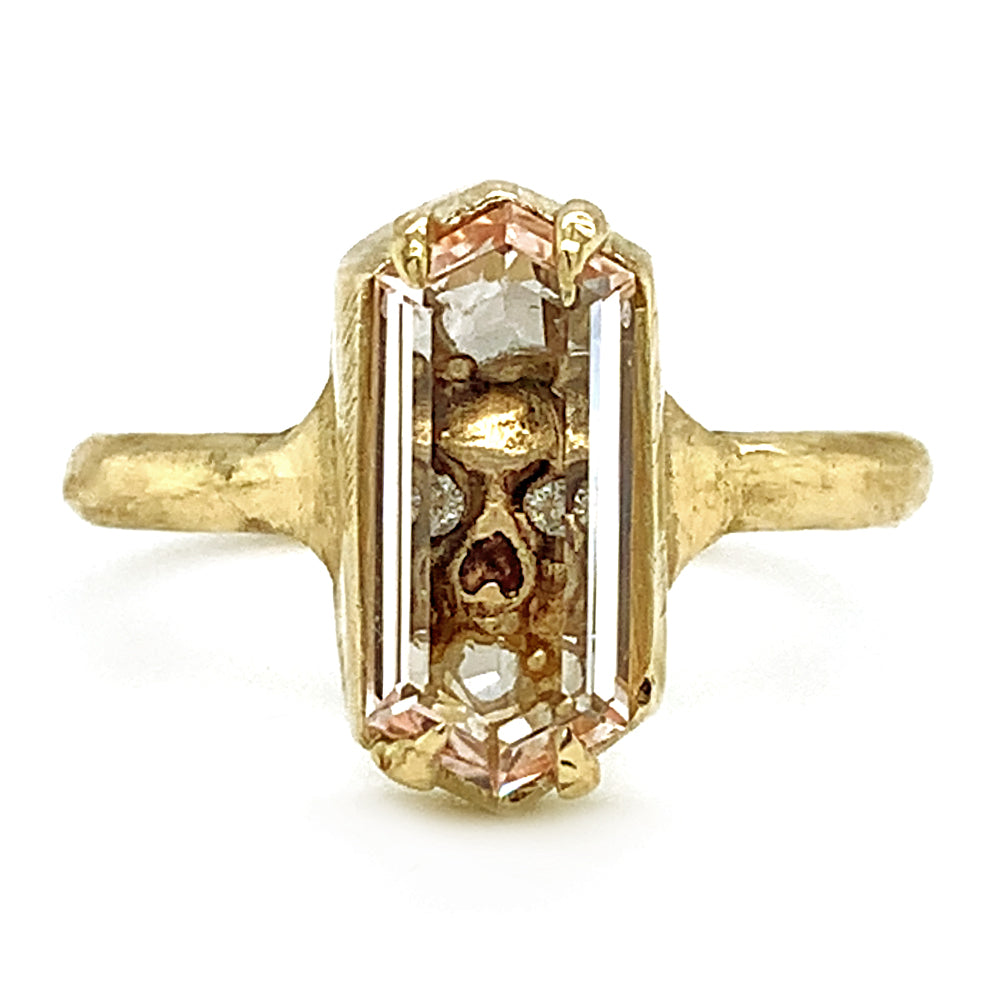 The darkened beauty of this ring is only enhanced by its morbid, haunted theme. A skull, white diamonds set into empty eye sockets, peers out from behind an elongated shield-shaped portrait-cut Morganite stone, the faint pink tint blending softly with the yellow gold. Elegant and regal, sinister and daring, this ring is a masterpiece of darkness and light.