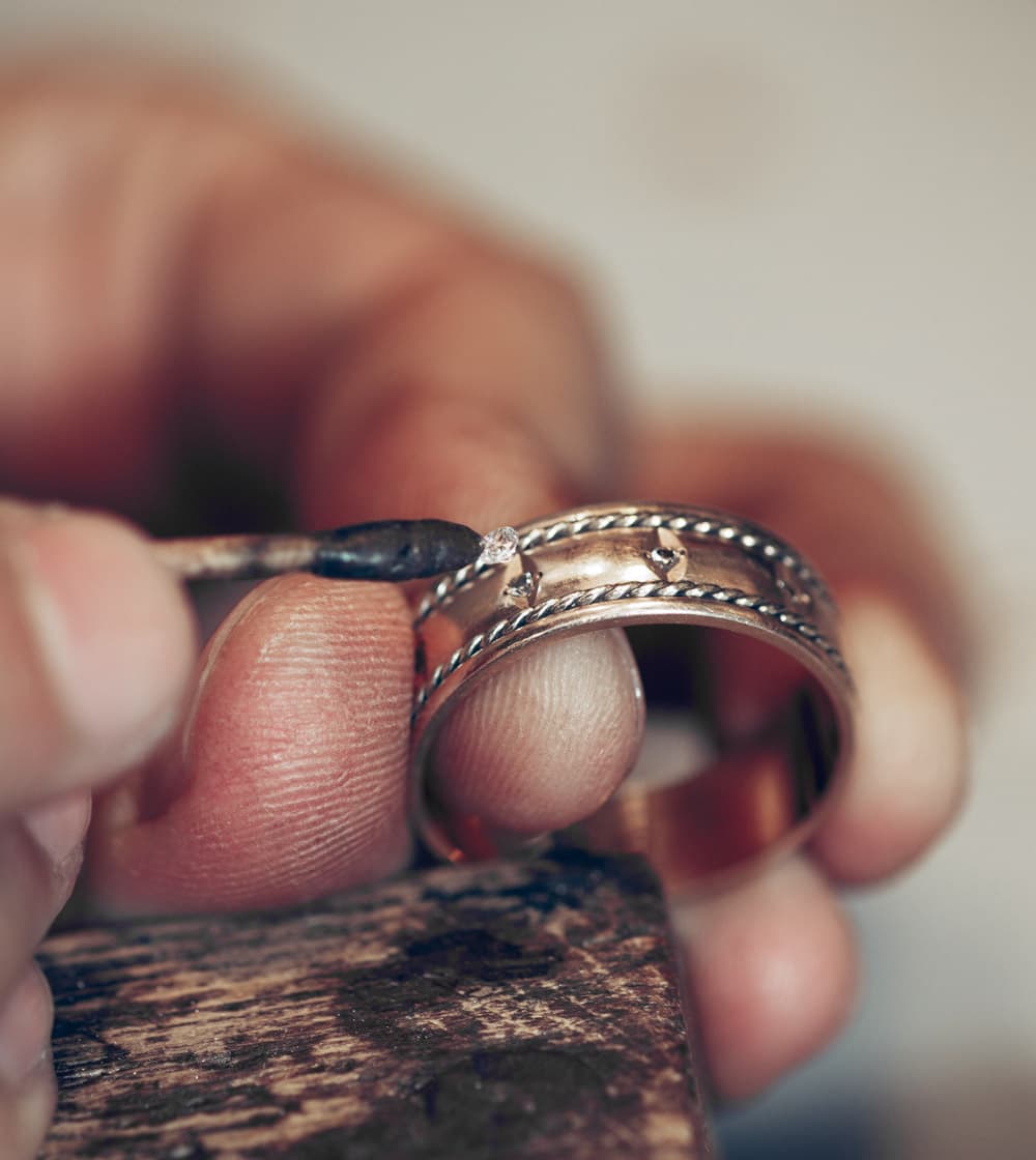 Pavé-setting:  meaning “pave” in French, this technique involves filling a surface or line with gems, most typically diamonds.  The holes can be drilled either in wax or in metal, and are slightly smaller than the sizes of the stones.  Then, a pointy tool called a “graver” is used to scoop the surrounding metal into series of low-level prongs which hold the stones in place.  Additional bumps are created, to make it difficult to distinguish where the stones end and the metal begins.  Since the stones are fairly flush to the metal’s surface, they don’t receive much abuse.  But, since they are held in by what are actually very tiny prongs, it is wise to have pavé work checked annually, so that retipping can be done as necessary.  If the pavé area is rhodium plated (to make it a bright white), that may need to be redone in about ten years or so; sooner, if it is exposed to harsh chemicals. To clean, simply leave overnight in your jewelry cleaning solution, and rinse underneath and above in running tap water.  Simply dab a facial tissue underneath the stones to sop up any remaining water without leaving lint.