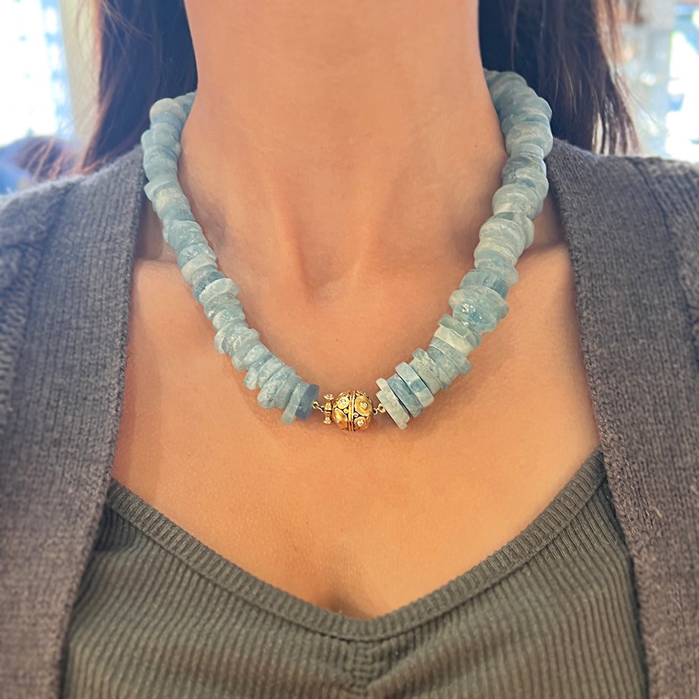 Beaded Rough Aquamarine Disc Necklace with Diamond Lilies Clasp - "Glaciers Edge"