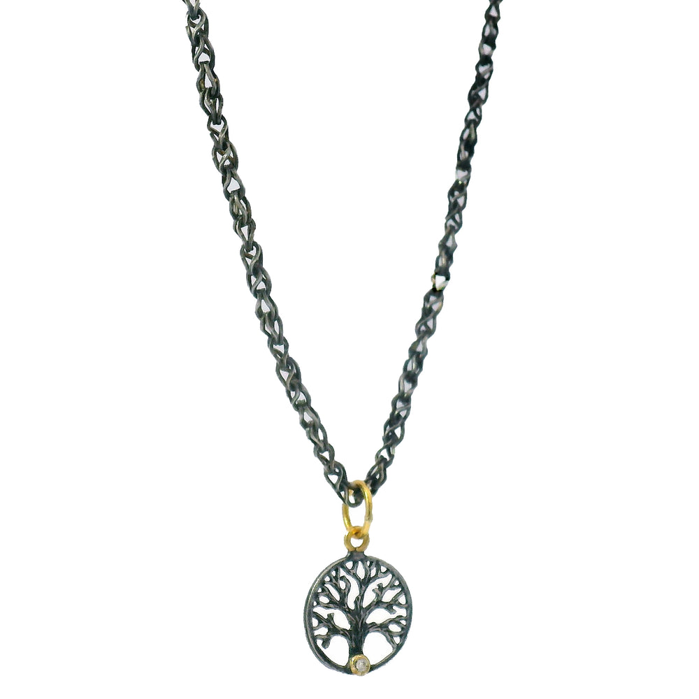 A branching tree sits within a circular frame, representing the enduring symbol of connection between earth, heaven, and all living things. Its branches and roots evoke stories from history and myth, where this motif appears across cultures as a sign of wisdom, life, and renewal. A white diamond accents adds a subtle glimmer to the oxidized silver and gold creation.