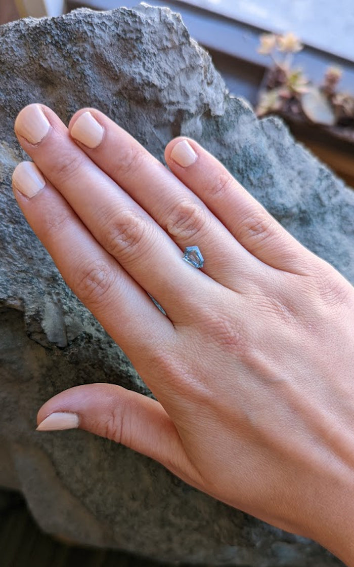 With light glinting off step-cut facets, this shield-cut Montana sapphire appears like a shard of the heavens - a piece of stormy sky caught and frozen in crystal form. Gazing into this gem will leave you feeling an otherworldly sense of wonder.