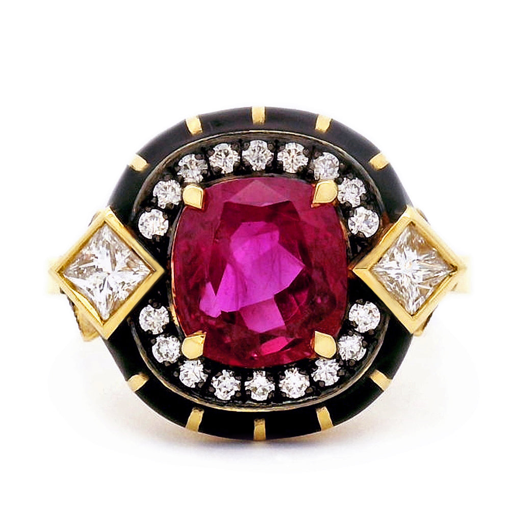 This one-of-a-kind ruby ring is chic & glamourous! The cushion-shaped ruby center is surrounded by a twinkling diamond halo and is tied together by black enamel. Princess-cut diamond accents flank the ruby center from within golden bezels, further accented by petite sparkling diamonds set into the shoulder design, peeking out from the sides of the ring. This high-fashion design is vibrant and sparkling... the expertise that shines through each exquisite piece of custom-crafted Lord Jewelry is inspiring, and each design is a keepsake with a story to tell.