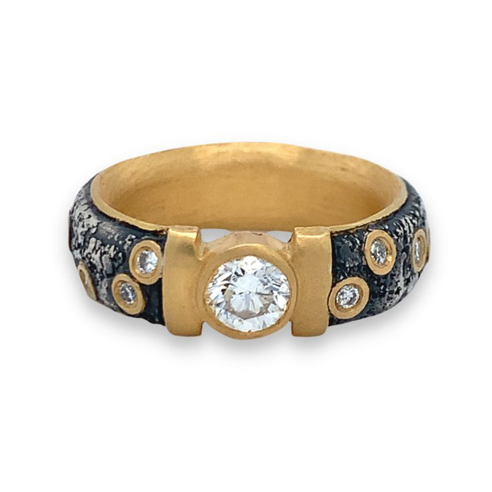 Wear the stars with this scattered diamond Michael Jensen ring! The 22K yellow gold and distressed sterling silver make this ring look straight out of a treasure trove. Uniquely beautiful, this piece would stun on any finger- but also works as an alternative engagement ring for that special lady.