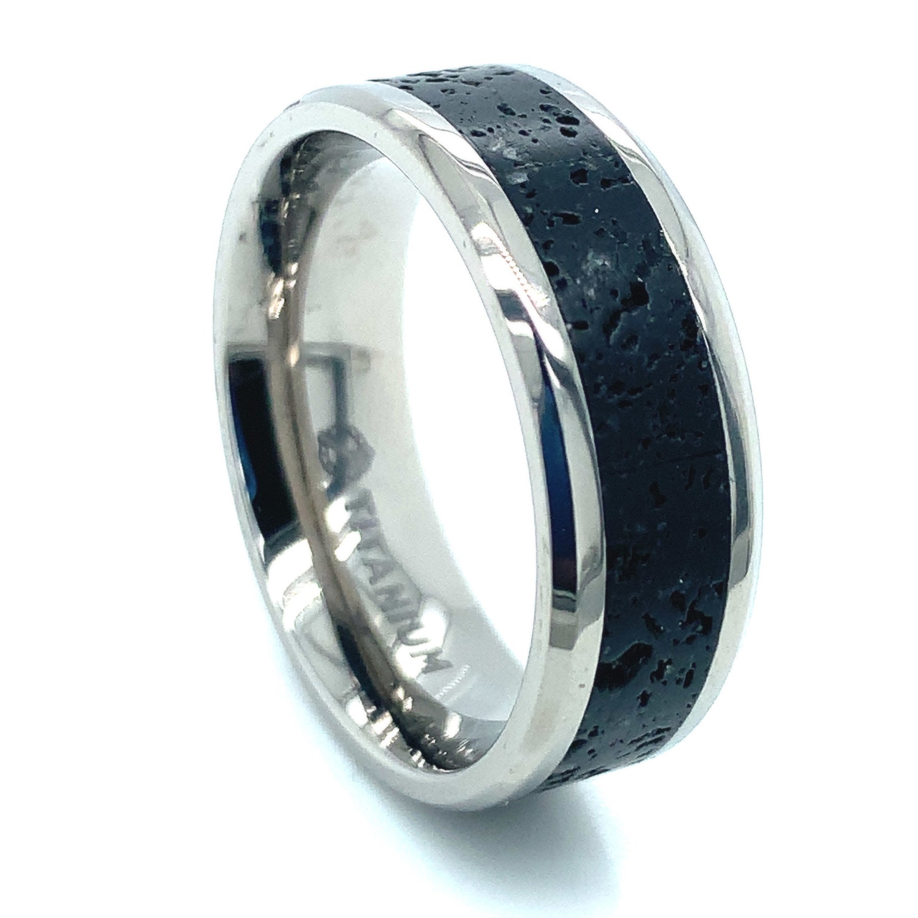 This titanium band by Thorsten features a bold black lava inlay nestled between sleek beveled edges.Â