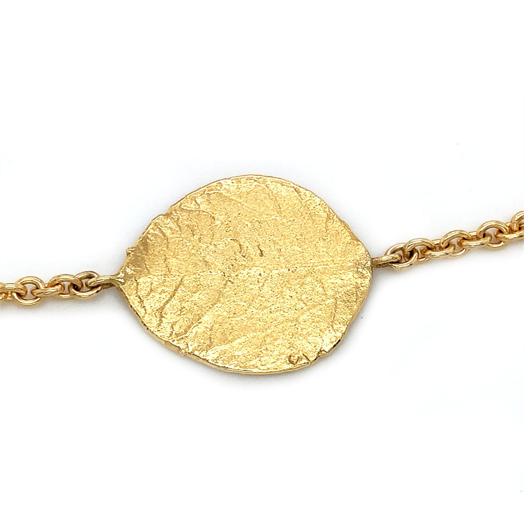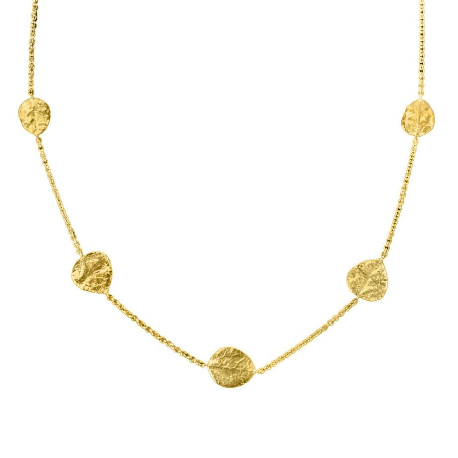 This yellow gold station necklace features five delicate aspen leaves that seem to float along the chain, as if caught in the gold itself. Each leaf is finely detailed, with veins and lines that capture the essence of nature's fleeting beauty. A beautiful tribute to the forest, this necklace feels like wearing a golden touch of autumn.